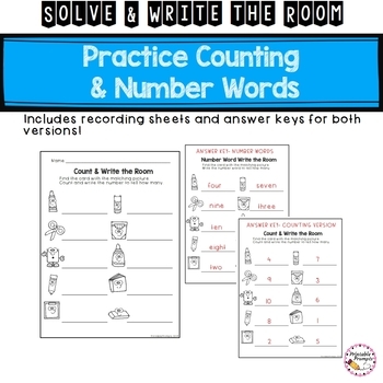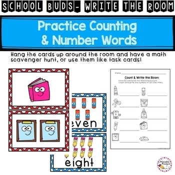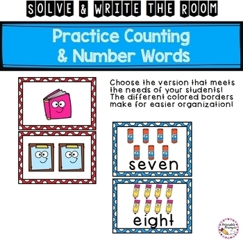 This math center will get your students moving while engaged in practicing counting school themed objects to 10, and reading and writing number words to 10! This makes for a great math scavenger hunt type center or for use as a task card activity. This is perfect for kindergarteners or as review for first graders. Different colored borders for each practice set allows for easy organization and differentiation.