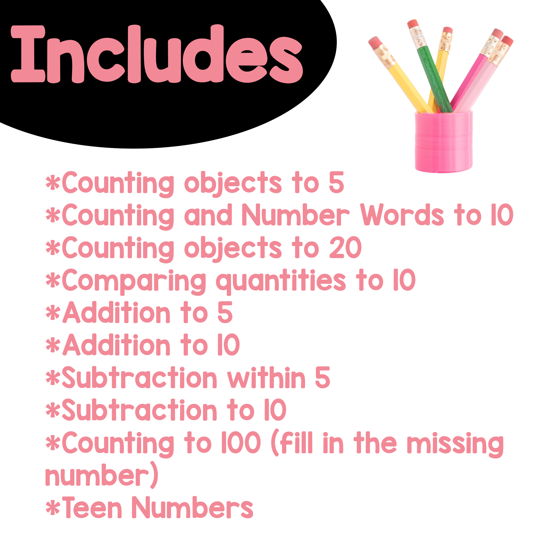 Have low prep write the room math stations to meet kindergarten standards at your fingertips all year long with this bundle! It includes 12 ready made resources to count, represent quantities, add, count, compare and subtract! Get your students up and moving by hanging the cards for each skill around the classroom, or place them in a task card station.