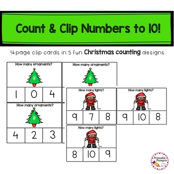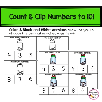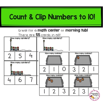 Includes: 5 Christmas themed clip card counting sets- Numbers 0-10. gingerbread Carolers * Lights Candy Ornaments Black and white versions of each card.