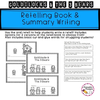 Goldilocks Retell Craftivity- Black/white AND color pieces to cut and glue to create a setting and color cut and glue characters to make Popsicle stick puppets to move along the setting as they retell! The color pieces are great for making a sample or creating the set for students to use in a retelling center!