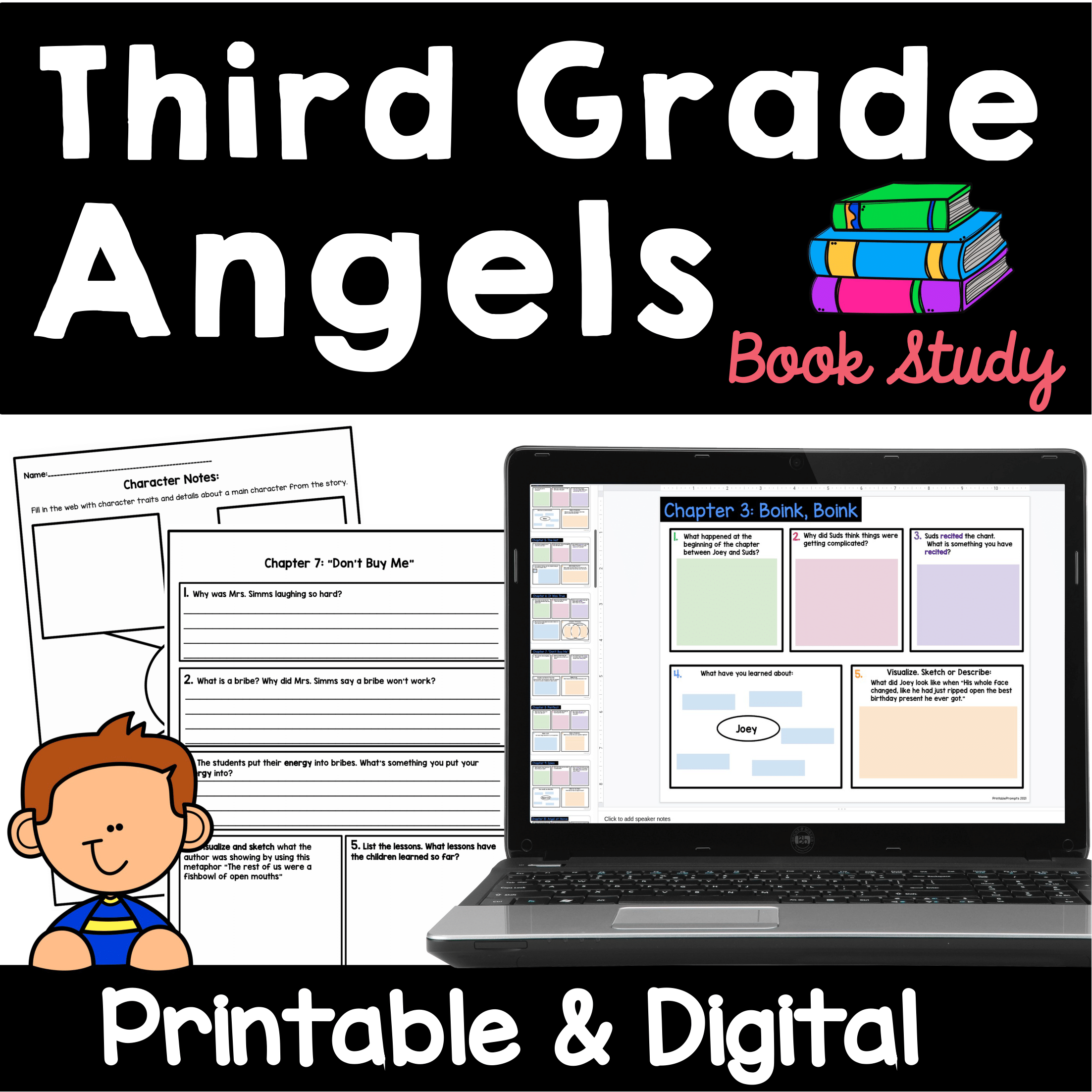 Third Grade Angels is a favorite story for back to school. This low prep novel study helps build comprehension and both the digital (Google Slides) or printable versions are included. Chapter questions, book discussion, and text evidence prompts guide students through literature circles, independent reading, or whole group reading activities.