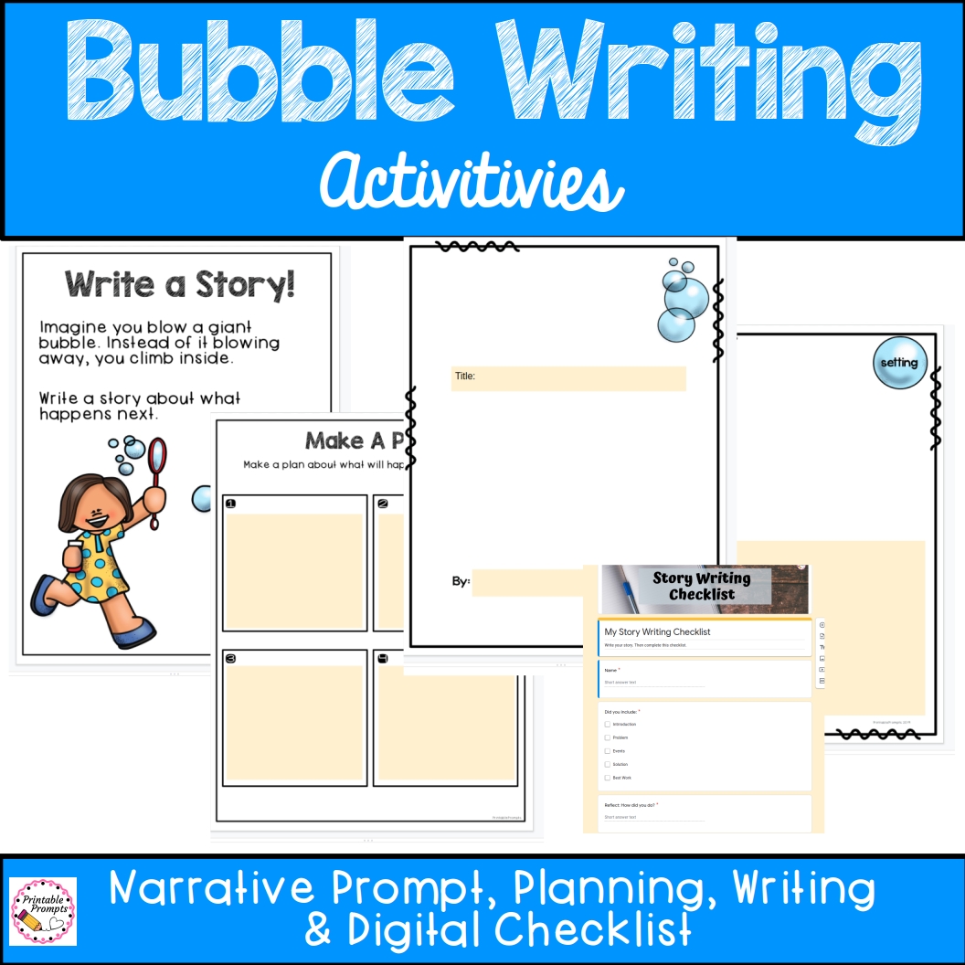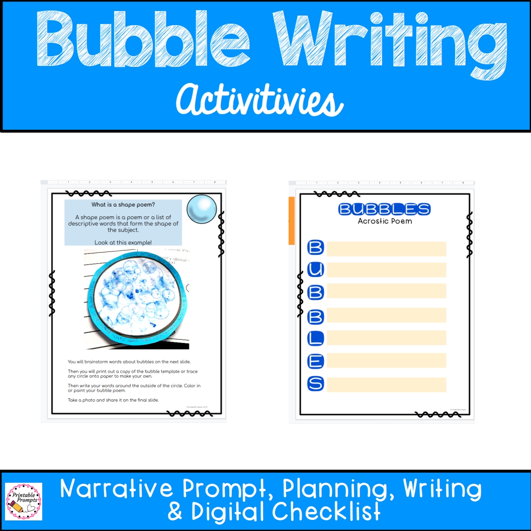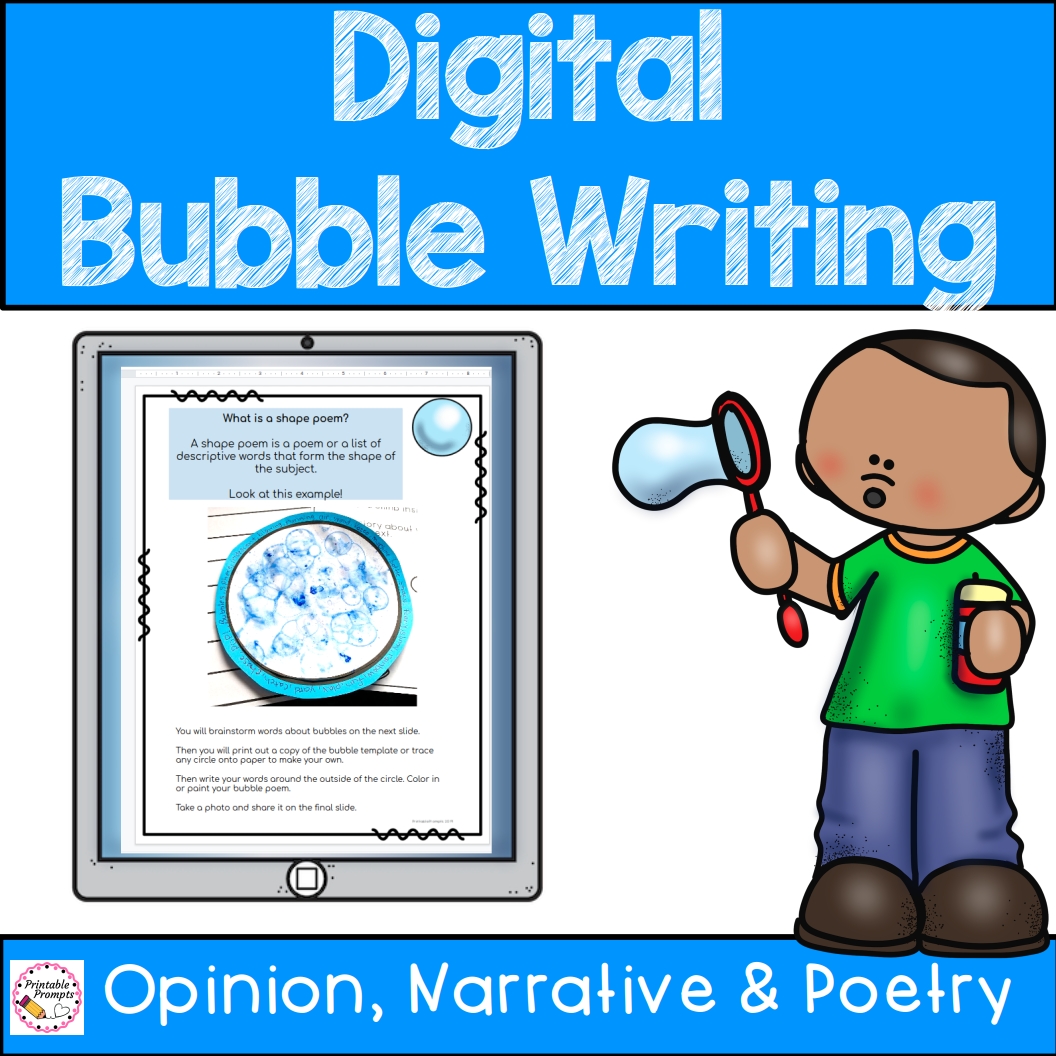 These digital bubble themed writing activities are great for the end of the school year, back to school time, or even a summer camp or summer school. Narrative, opinion, and descriptive shape poem writing are all included in a digitally accessible way to help students engage from a distance with Google Slides files. Includes: