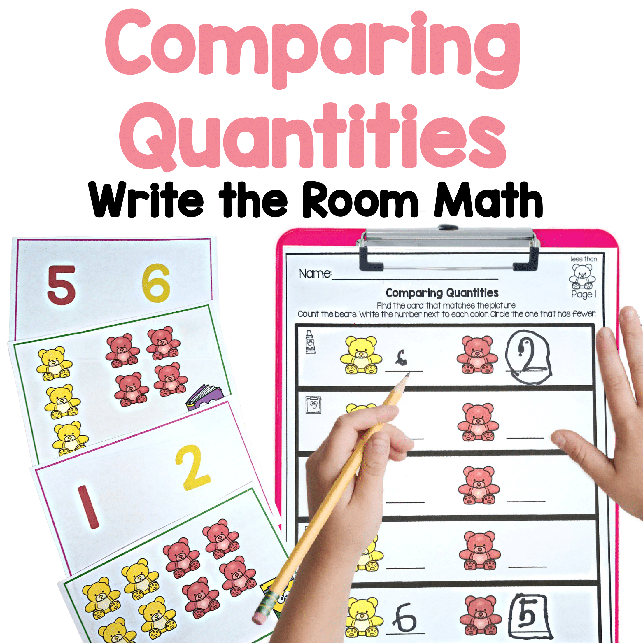 Get your students up and moving with this comparing quantities write the room math activity. Use either set of task cards to place around the room or in a center and students can compare quantities using objects and compare quantities using numbers to 10 in order to support kindergarten counting and cardinality standards.