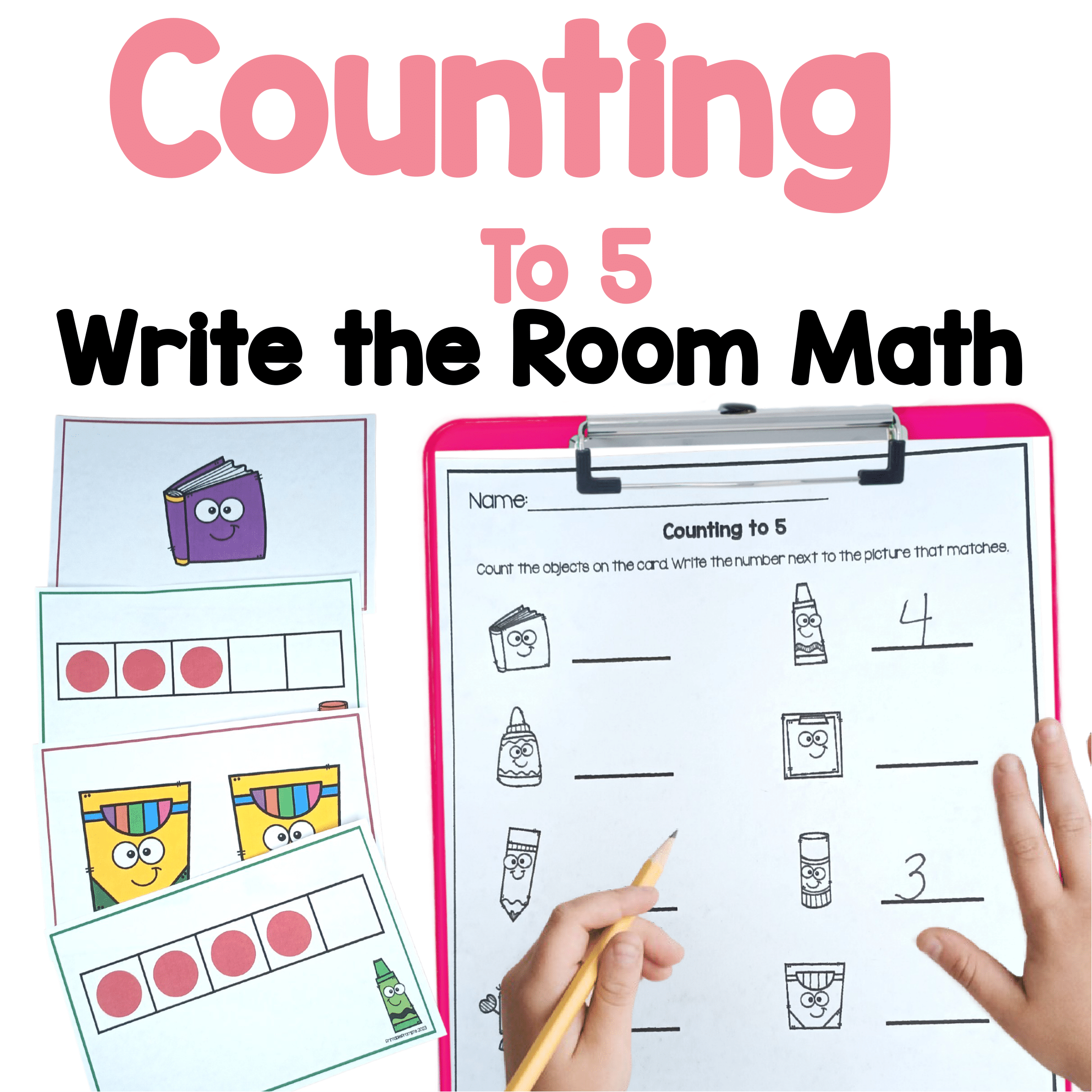 REGULAR PRICE: $1.00 DISCOUNTED PRICE: $2.00 Count and write the room with this fun math center. Set it up like a math scavenger hunt or task card station and students will use the two sets of cards to count quantities of objects to 5 or count using five frames. Reinforce kindergarten number and counting skills with this low prep and engaging math activity!