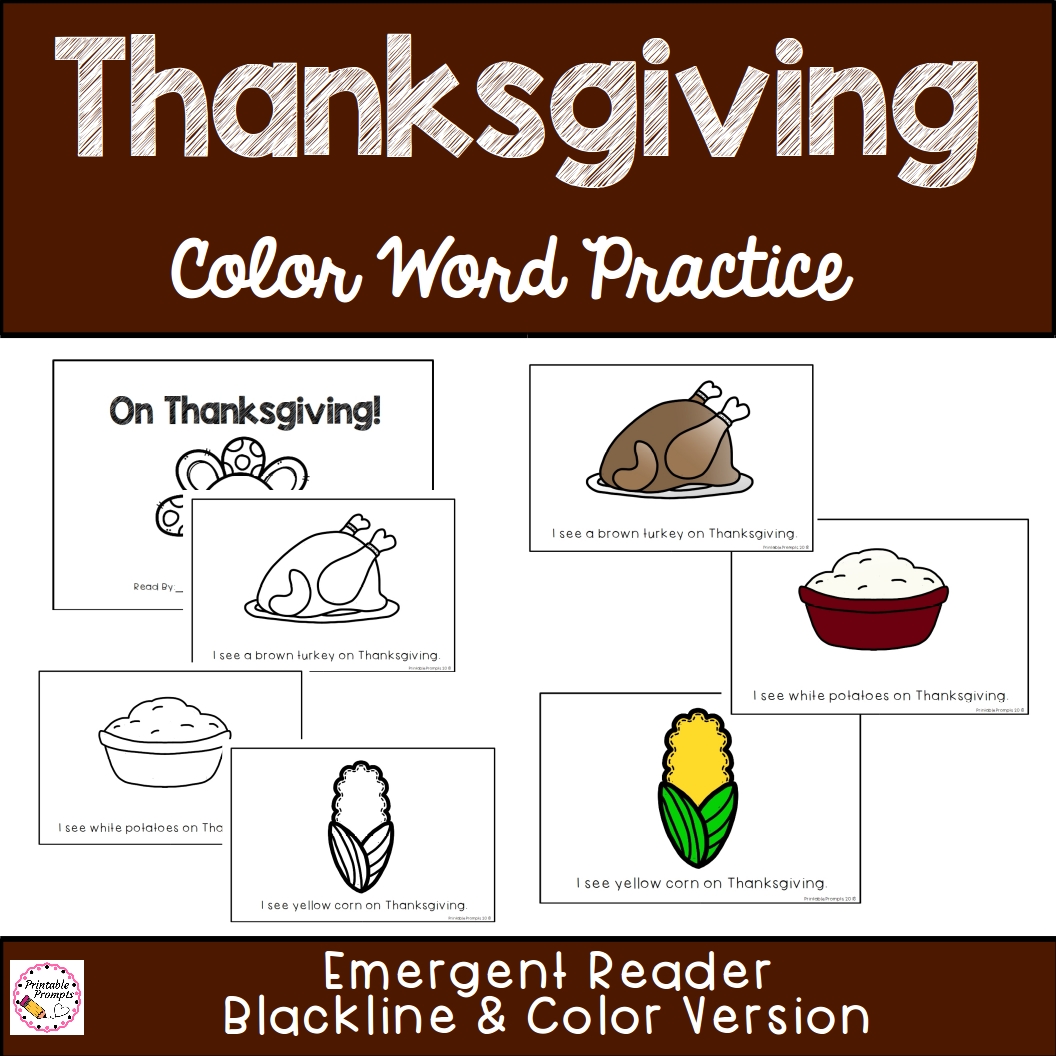 8 page emergent reader offered in blackline and color version with the colors orange, red, brown, white, yellow, tan, gray, green- all labeling Thanksgiving themed vocabulary.