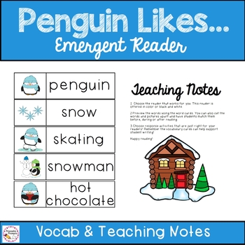 Printable mini books are great for guided reading groups and literacy centers. This emergent reader about what the penguin likes to do in winter provides an easy way to add just right books to your kindergarten and first graders book boxes as well as provide extension and written response activities. Word wall vocabulary cards are great to support reading and writing about winter.