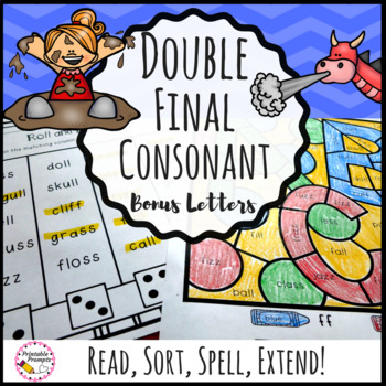 Practice reading and spelling words with double final constants. Sort words with bonus letters ss, ll, zz, ff . Extension read and color by code, roll and color, and silly sentence fun are perfect for keeping first graders engaged while they practice double final consonant words.