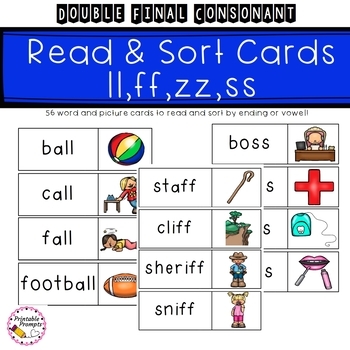 This pack provides word and picture cards (56 word cards total), sorting activities, and practice pages(2 per ending letter) for the Double Final Consonant/ Bonus letter rule for F, L,S,Z.