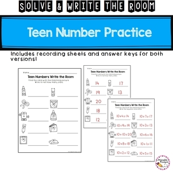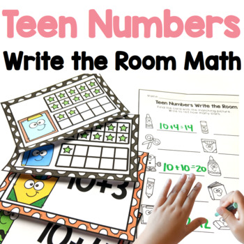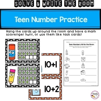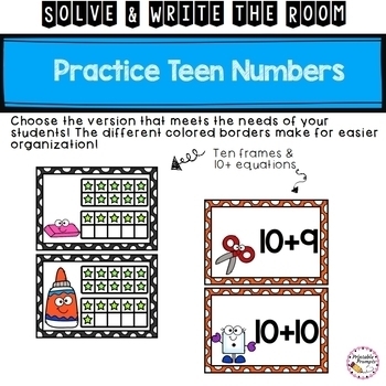 This math center will get your students moving while engaged in practicing counting 10 frames with teen numbers, as well as teen number equations represented as ten and some more. This makes for a great math scavenger hunt type center or for use as a task card activity. This is perfect for kindergartners or as review for first graders. Different colored borders for each practice set allows for easy organization and differentiation.
