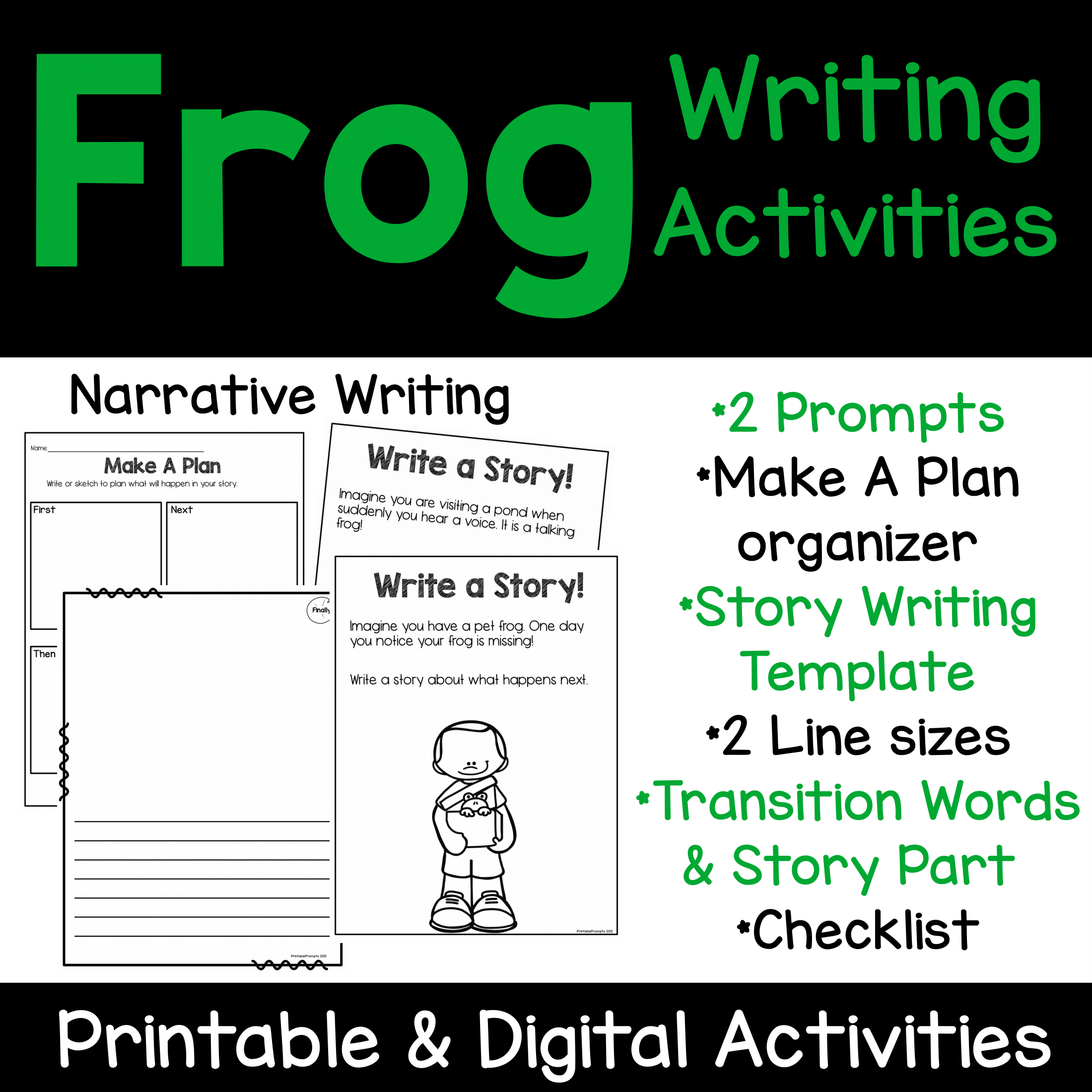 2 Prompts to choose from Planning Page Book writing templates with 2 line sizes, and guide words (either transition words or story parts... or use the blank template if you'd rather not have guide words) One page story template Narrative Checklist