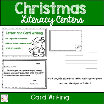 4 fun Christmas themed card designs offer a fun writing center opportunity. Print 2 sided to include a basic letter writing template on the inside.