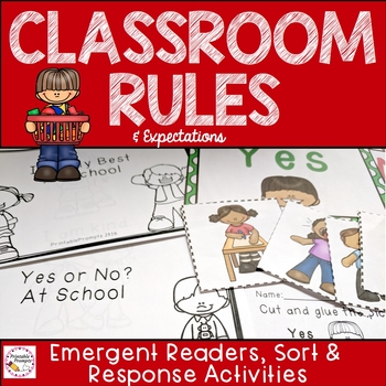 This emergent reader set is differentiated for your learners to review school rules and classroom expectations. You can share a full sized version of each book with your class or group, individual blackline printable booklet versions for students to read, extension response, and sorting, all to help you teach and reinforce classroom rules and expectations!