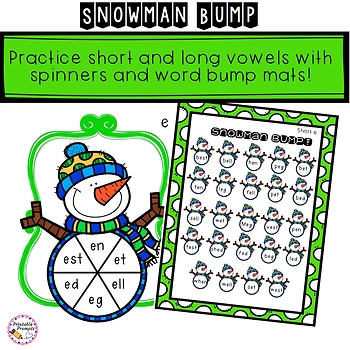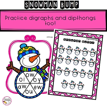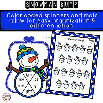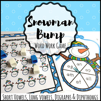 Practice short vowels, long vowels, digraphs, and diphthongs winter word work practice game. This Snowman bump game features Matching snowman spinner and bump mats to allow for differentiated practice with an easy to organize color coded system. This game is offered in color so you can print, laminate and use again and again!