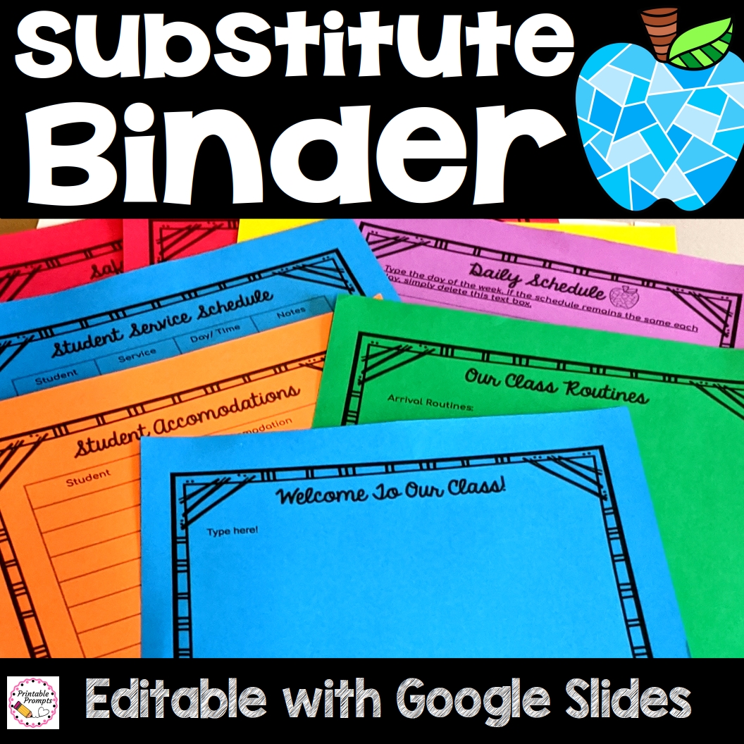 Writing sub plans and wondering if your substitute teacher will have all the information he/she needs? This editable substitute binder page template created using Google Slides includes suggested materials to include in your sub binder.