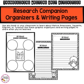 1.Research Companion Materials- Web organizer and writing pages (2 line sizes) to use when you learn about Native Americans, Pilgrims, Squanto, and Turkeys!